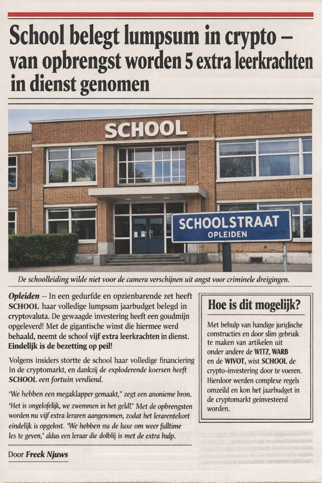 Nu is dit nog herkenbaar door de bewust gekozen namen, maar wat zou er gebeuren als ik de foto van de school twee straten verderop gebruik met de naam van die school? Dan is het ineens heel echt, helemaal als ik Freek Njuws vervang door de naam van een van de redacteuren van de desbetreffende krant (makkelijk te vinden). Dan schieten een aantal mensen of partijen in de stress en heeft de schoolleiding een paar slechte dagen om zich alle journalisten van het lijf te houden.
