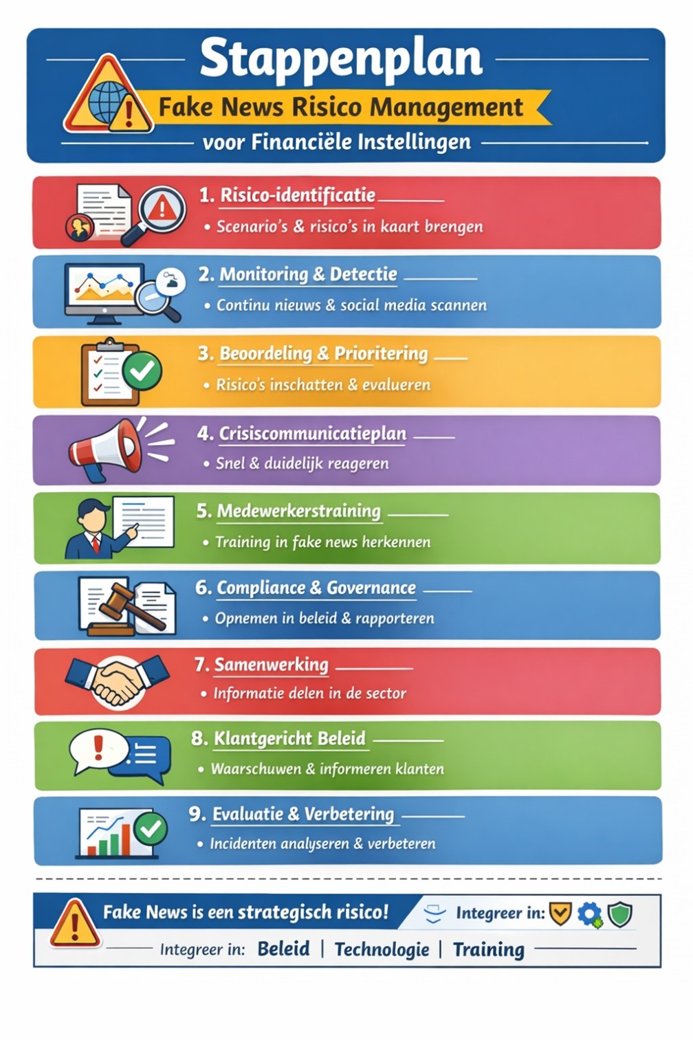 Bijvoorbeeld in de SIRA, zeker wanneer jouw reputatie belangrijke element is voor het aantrekken en behouden van klanten. Of in de risicomanagementcyclus; fake news kan ook over een product/dienst gaan en ook dat is een risico waaraan aandacht besteed moet worden.